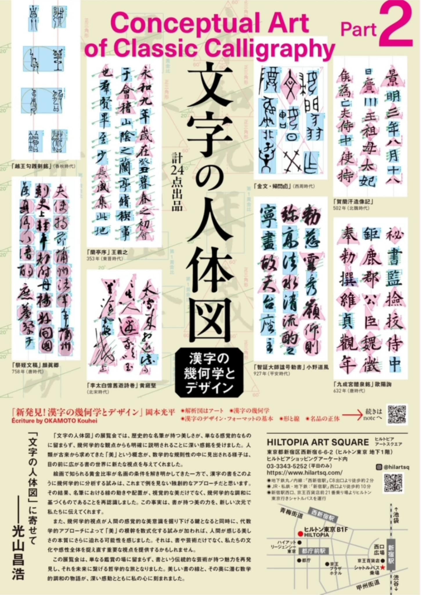 解析図は黄金比、3分割法、5分割法、9分割法、3種類の三角形、正円、正方形、また横画角度の規則性、画面構成などわかりやすく図示した24点の作品を展覧いたします。
