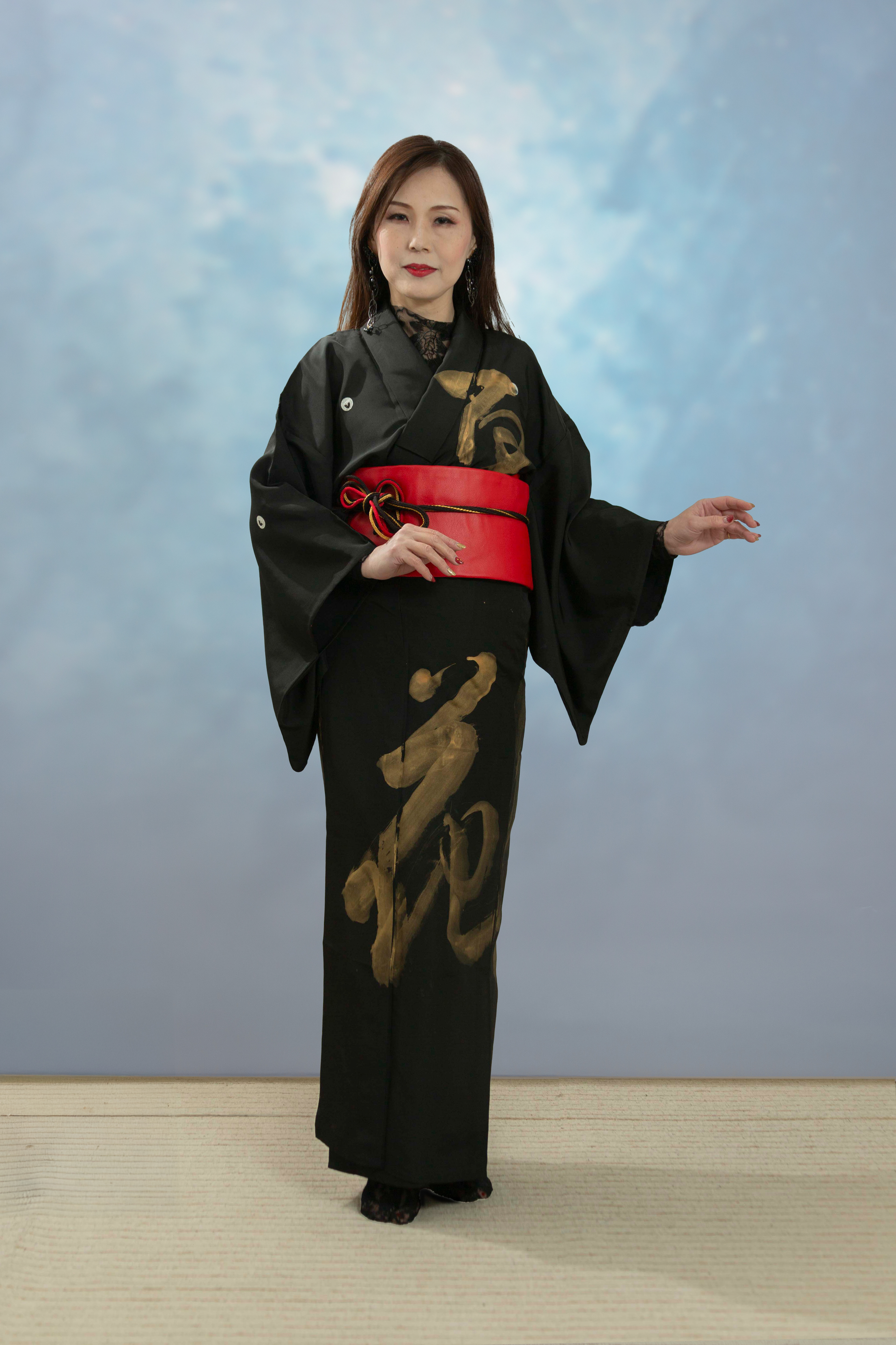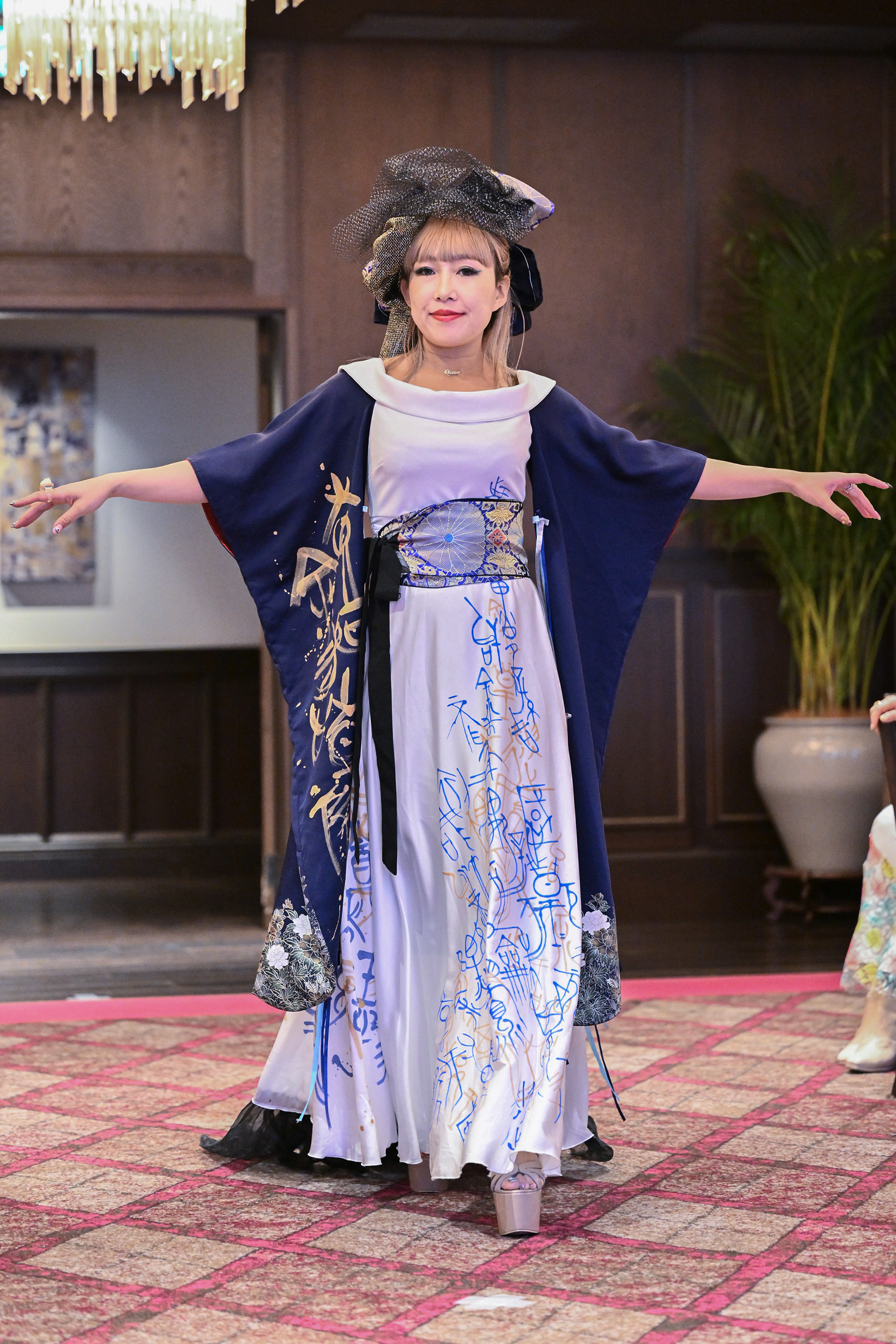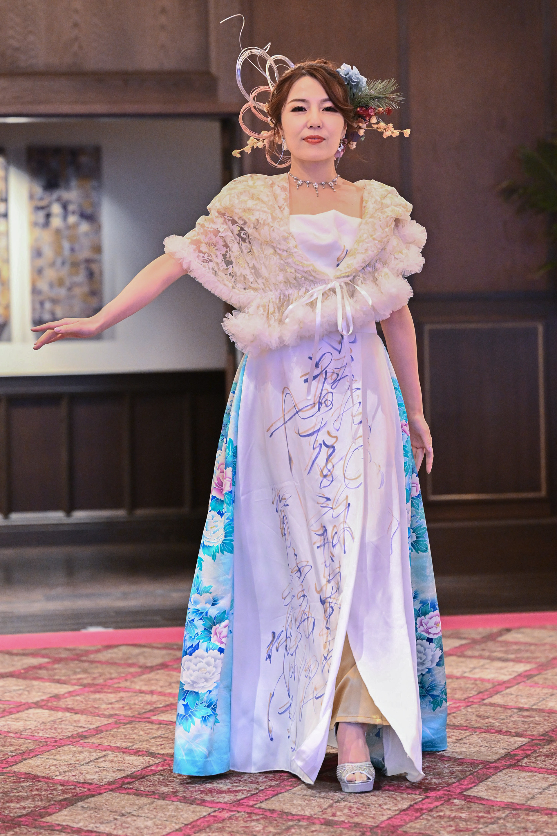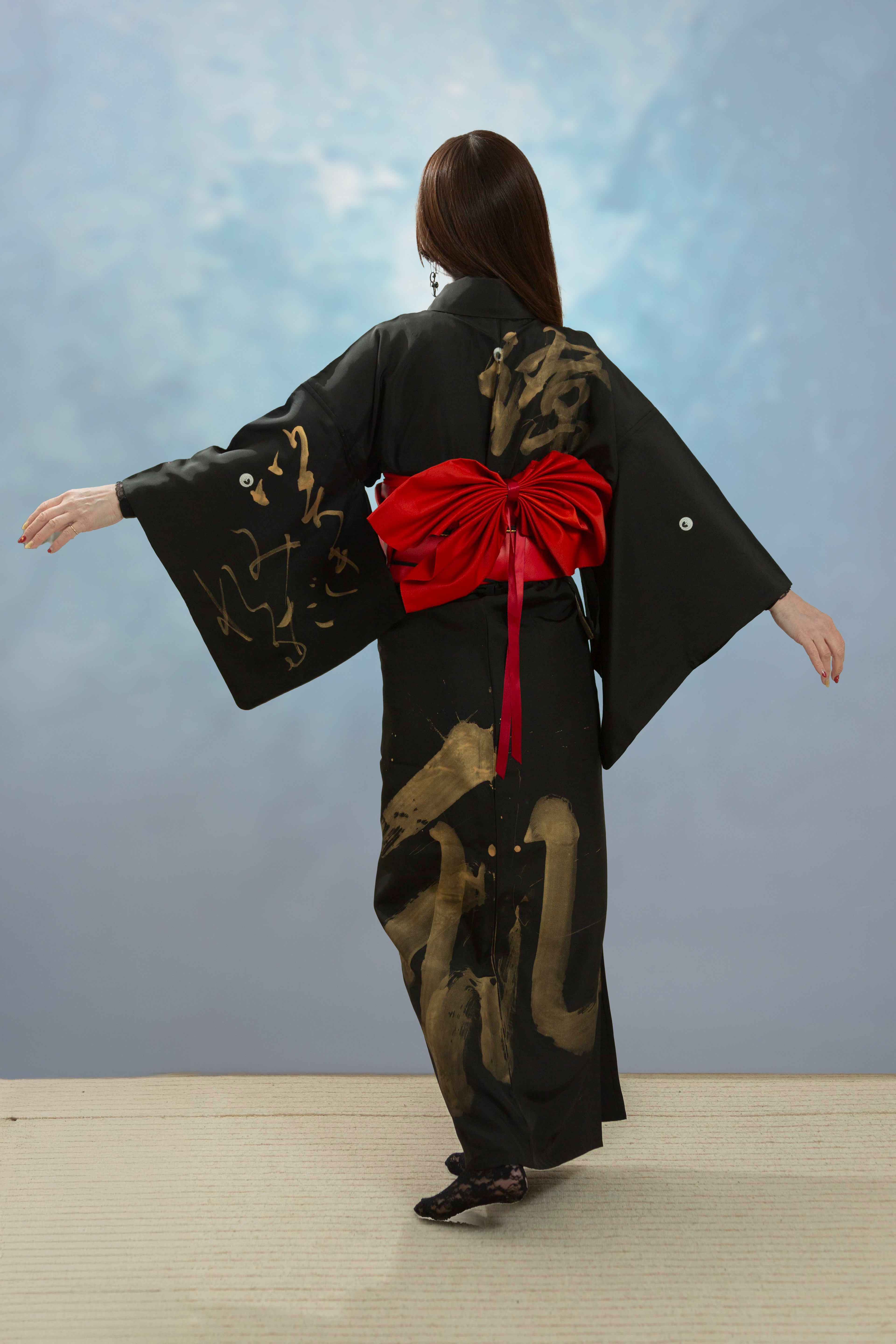 裾と肩に大輪の「華」をあしらい、背中には金のラインアートを施し、日本の伝統的な書と現代アートが調和するデザインとなっています。