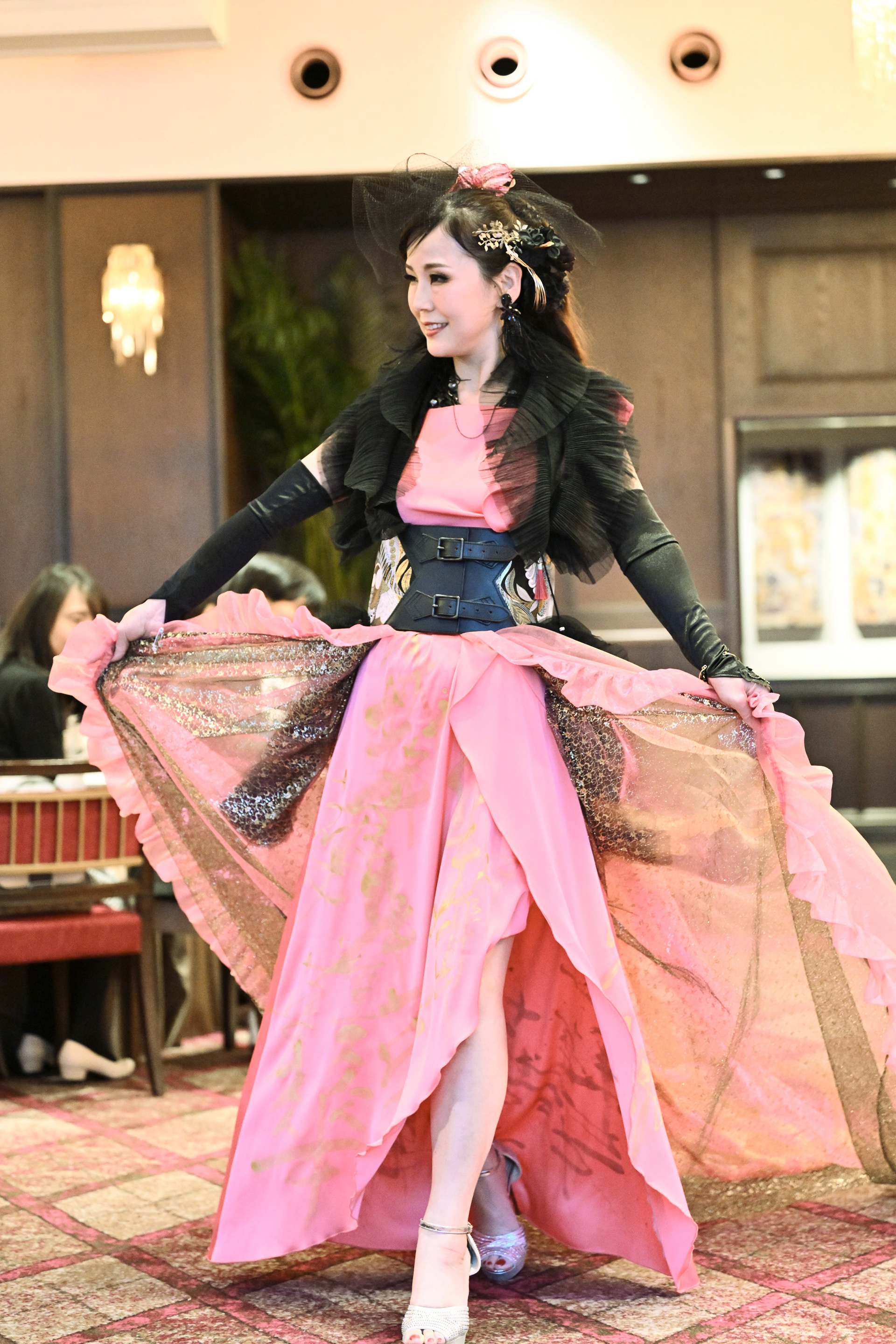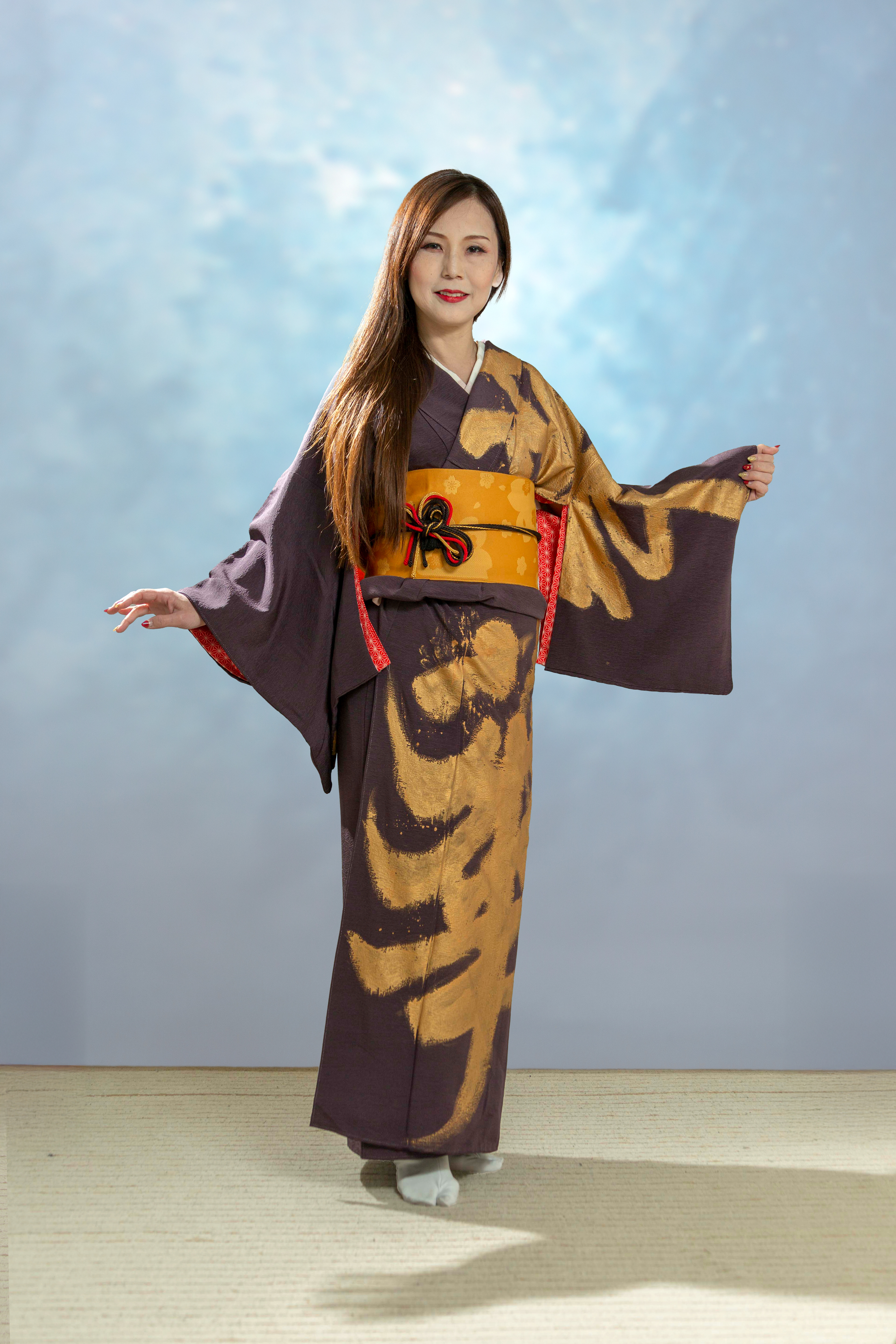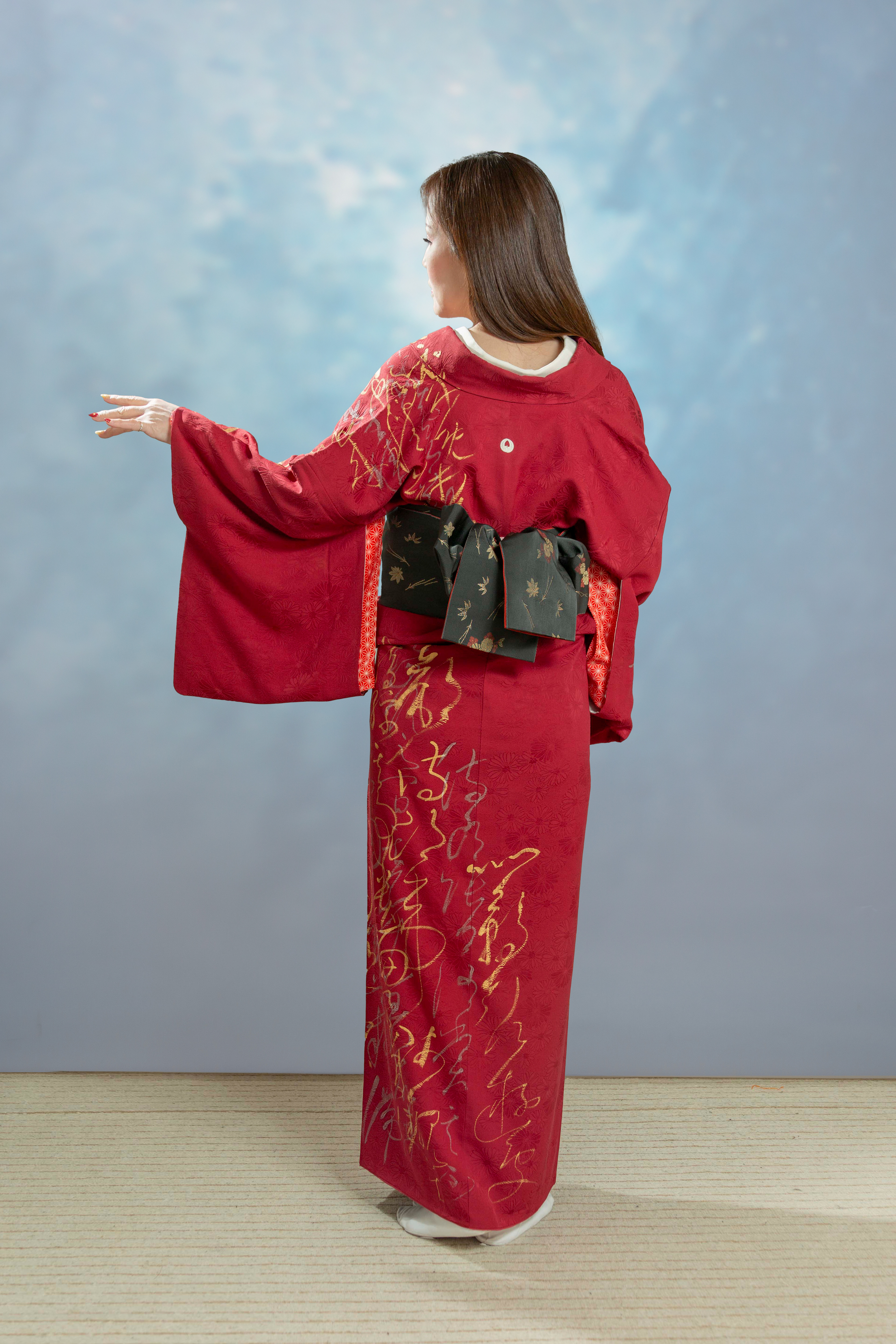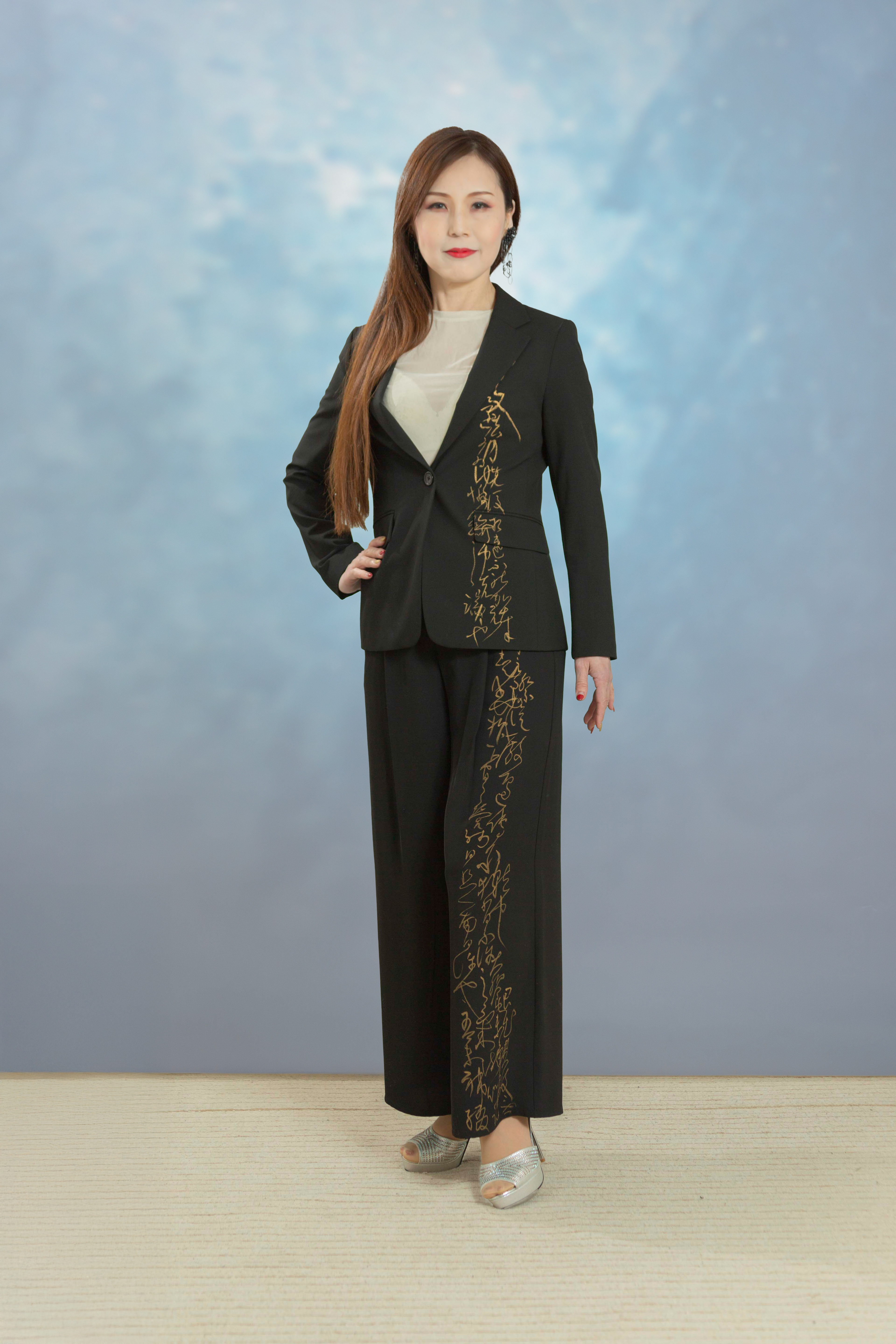 裾と肩に大輪の「華」をあしらい、背中には金のラインアートを施し、日本の伝統的な書と現代アートが調和するデザインとなっています。